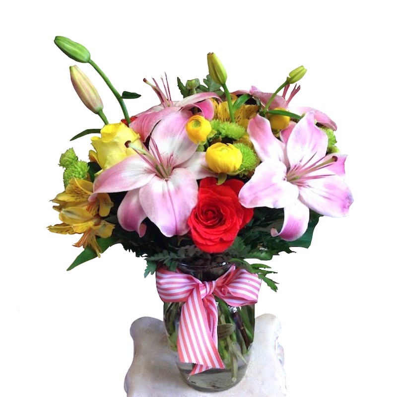 Pink asiatic lilies with a colorful mix of seasonal flowers in a glass vase.