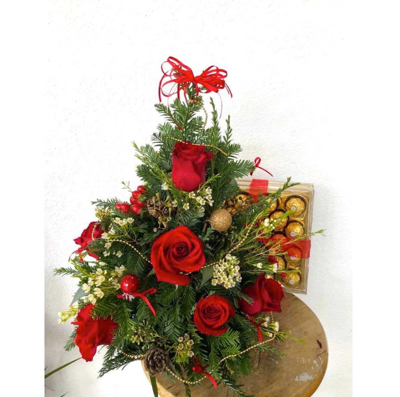 This mini tree is made of natural flowers, foliage and includes Christmas ornaments and can be used as a decorative element in an a desk or table. This gift is complemented with a large box of Ferrero Rocher chocolates.