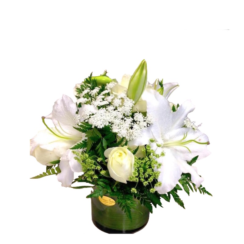 White lilies and roses with green and white fillers in a large cylindric glass vase