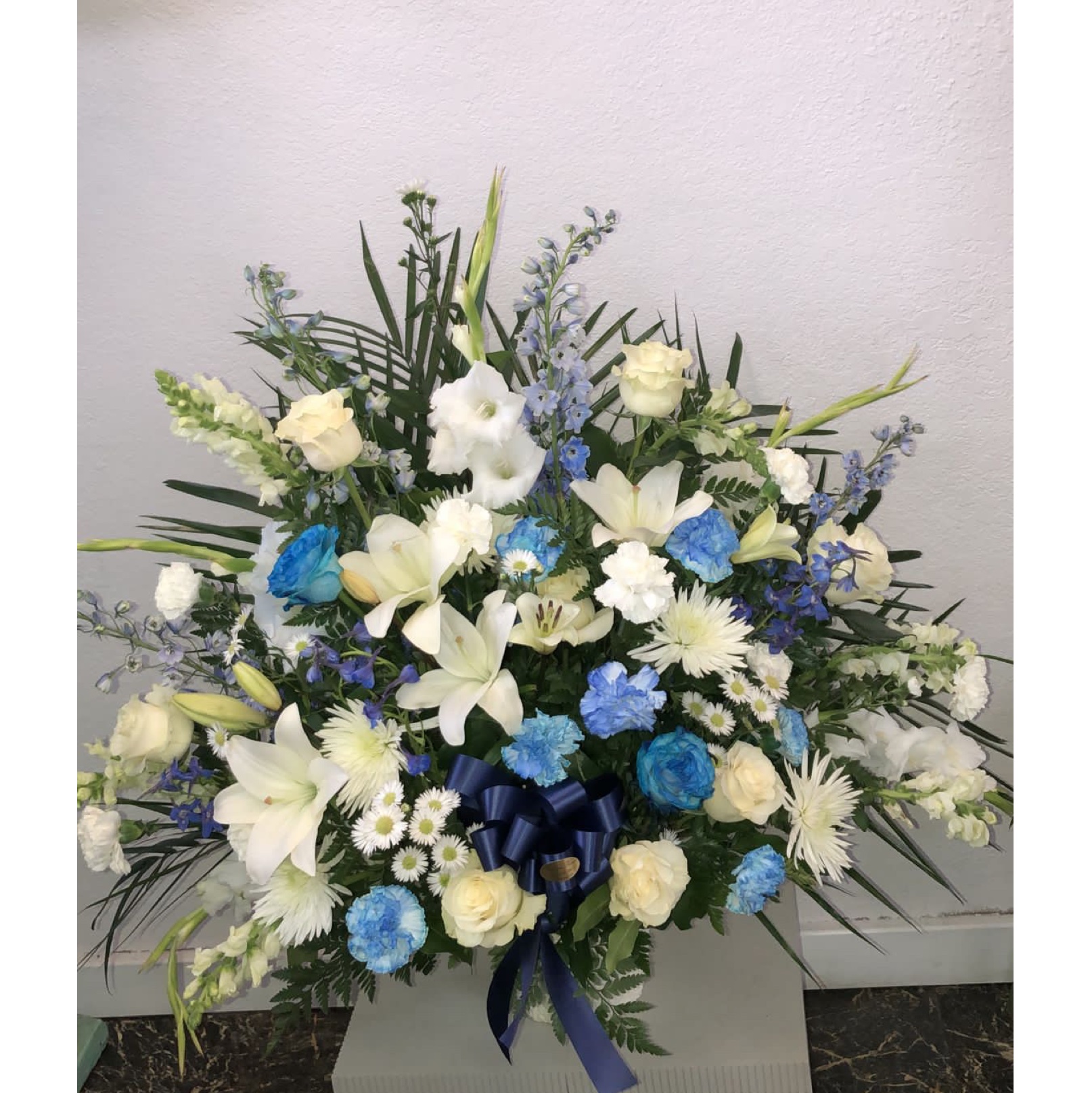 Floor Vase. Blue Moon Floor Vase. Funeral Flowers. Sympathy Flowers. Fresh Flower delivery. Blue and white flowers. Richmond CA