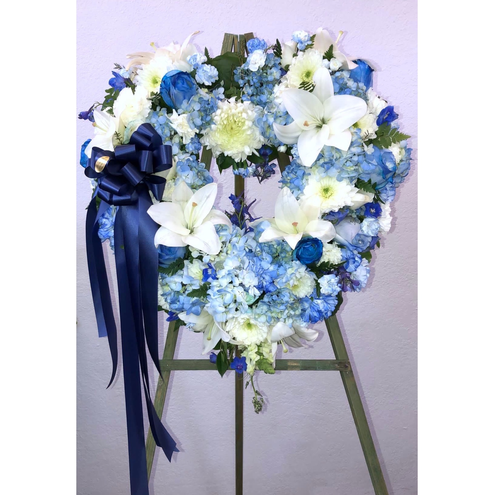 Blue Moon Heart. Standing Spray. Funeral Flowers. Sympathy Flowers. Fresh Flower delivery. Blue and white flowers. Richmond CA. Velorios