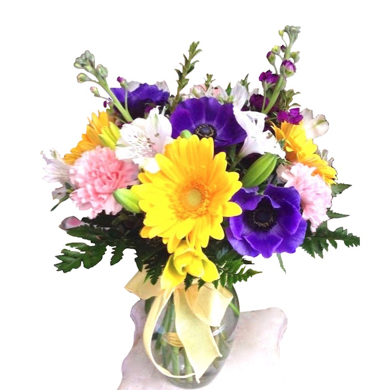 Combination of gerbers, lisianthus, carnations, stock and alstroemerias in a glass vase with a yellow silk bow.