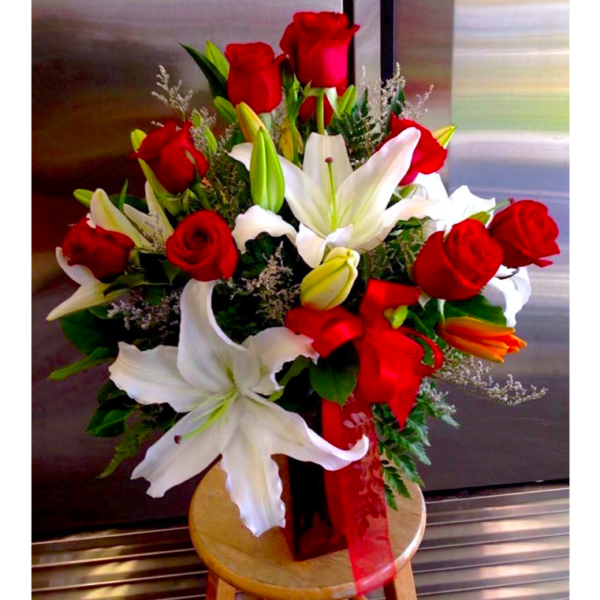 For the Brightest Love red  roses and casablanca lilies with a mix of fillers and greens in a glass vase with a red bow.