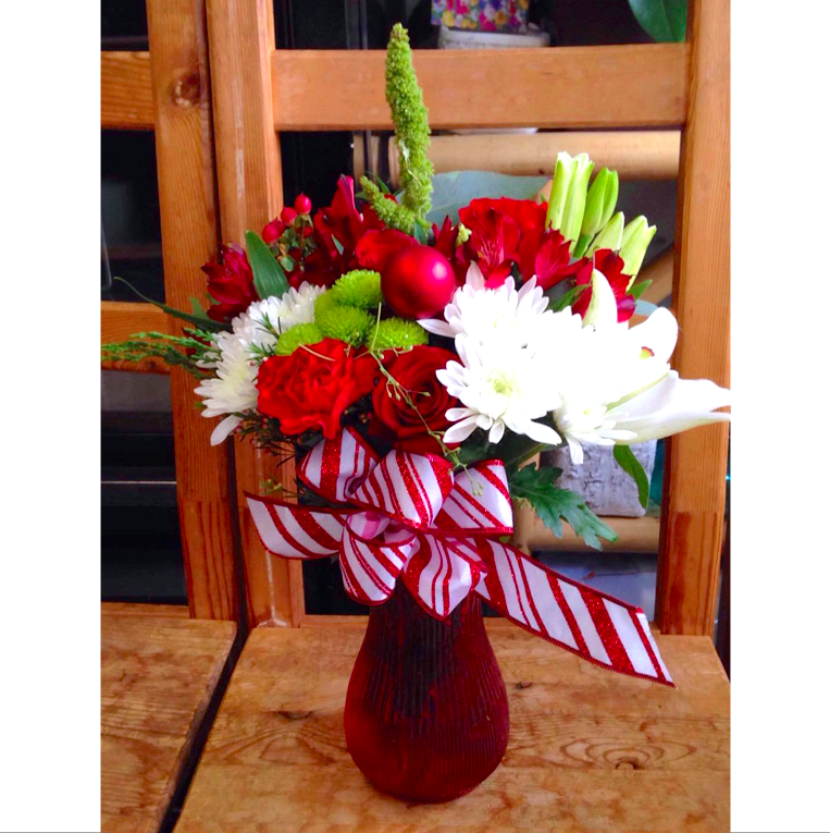 Red and white combination of flowers with christmas ornaments in a red glass vase with a matching bow.