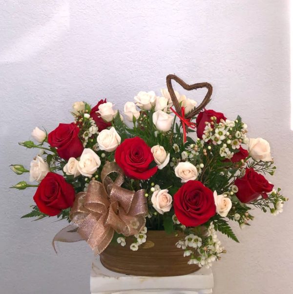 Classy and elegant a combination of red and white Roses in an aluminum copper color vase with green fillers.
