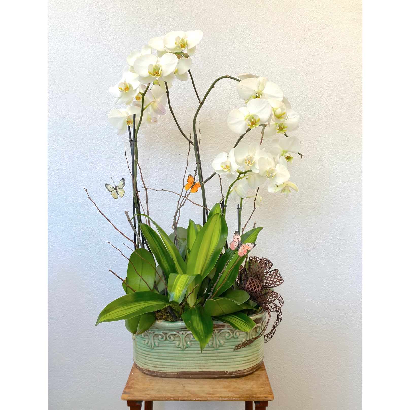 This ceramic vase, includes three different sizes of blooming orchids with indoor plants and some ornaments like butterflies.