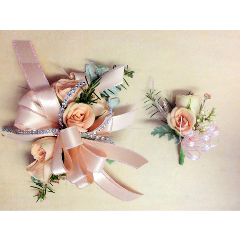 Duet peach silk. corsage and boutonniere. Prom Flowers. Prom Date. Peach Roses corsage. Flower delivery near Richmond CA. Local Florist.