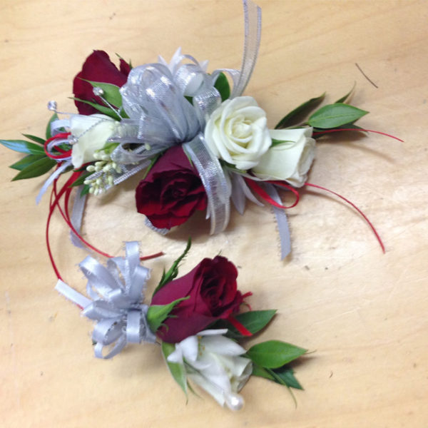 Duet Red and Silver. Matching corsage and boutonniere. Prom Corsage and Boutonniere. Prom Flowers. Flower Delivery. Florist near Richmond CA.