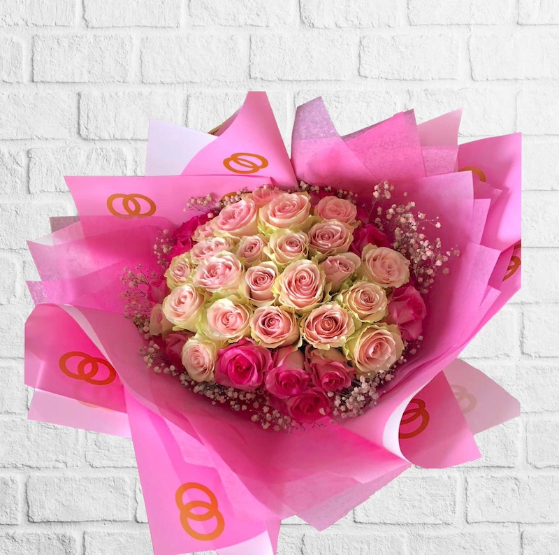 This is a bouquet of prime quality long stem roses in pink and hot pink wrapped in pink paper with golden logo.