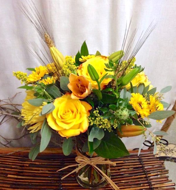 Yellow mix of flowers with fall ornaments in a glass vase.