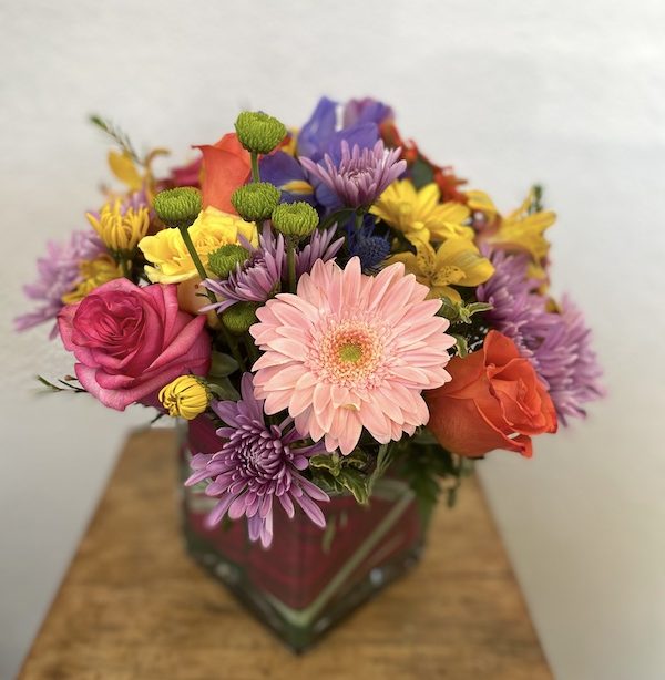 This sweet combination of colors mixes gerberas, roses, daisies and other seasonal fillers.
