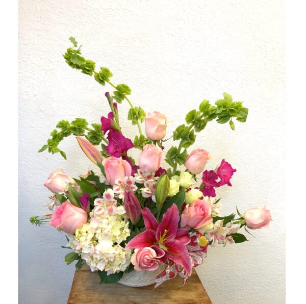 A gorgeous and exquisite combination of roses, lilies, alstroemerias, gladiolus and seasonal fillers in a ceramic vase. Ceramic vase with personality for home decoration.