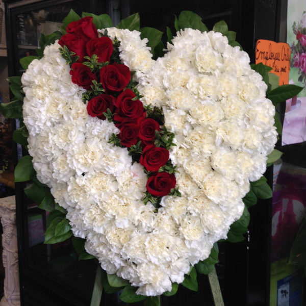 A full heart made of white carnations and red roses.