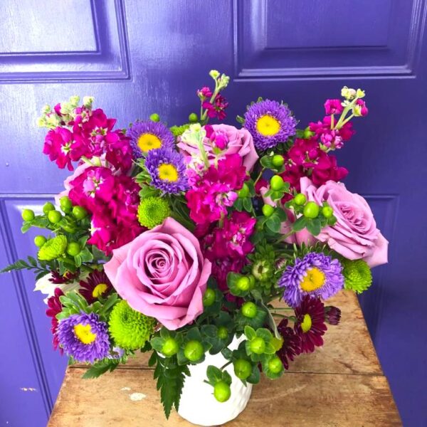 We have combined roses, stock, matsumotos and hypericum in a white ceramic vase.