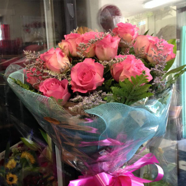 Pink long stem roses with limonium and green fillers wrapped in blue mesh.