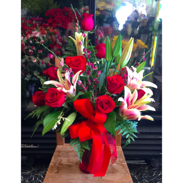 Red roses and star gazer lilies with a mix of fillers and greens in a glass vase with a red bow