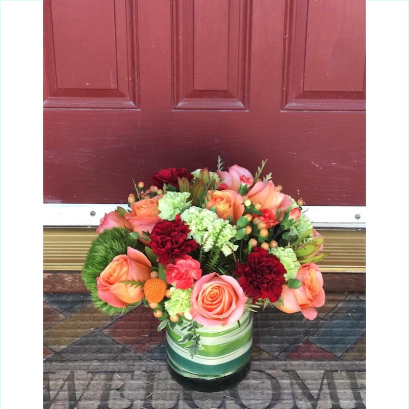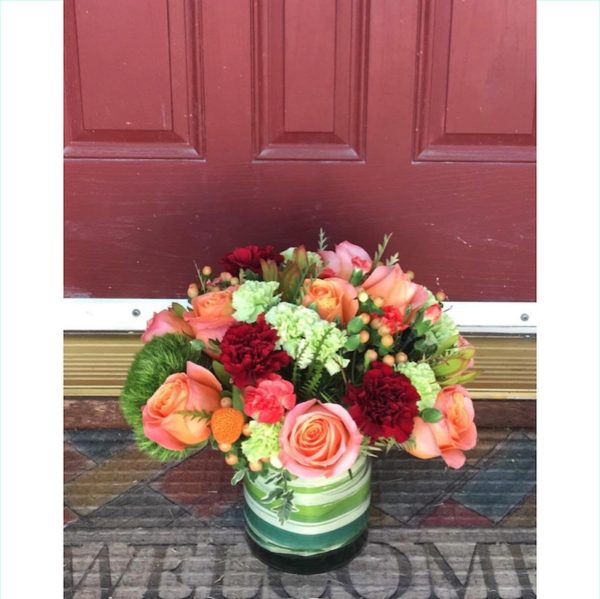 Mix roses, carnations, hypericum and seasonal fillers in a glass cylinder. Color or flowers: orange, green and red.