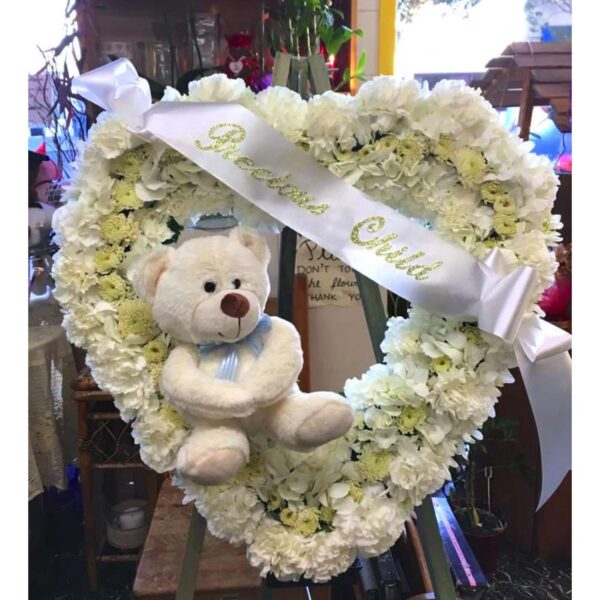 Precious Child Heart. White wreath for a child. Funeral Flowers. Sympathy Flowers. Fresh Flower delivery. White Flowers Wreath.