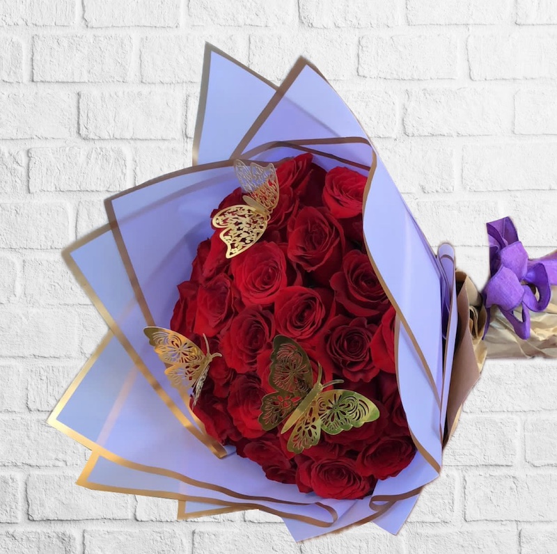 Pure elegance in a bouquet- our Red Roses Bouchon is a stunning arrangement made exclusively of fresh, premium red roses. This design showcases the timeless beauty of roses in their most classic form. Wrapped in the color of your choice and adorned with delicate gold butterflies, this arrangement is perfect for expressing love, admiration, or heartfelt emotions on any special occasion. Whether it’s a romantic gesture or a sophisticated gift, the red roses Bocuhon speaks volumes without saying a word.