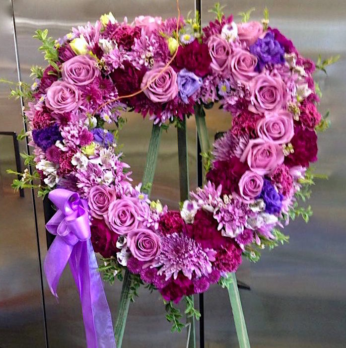 Reflections Standing Heart. Purple roses. Funeral Flowers. Sympathy Flowers. Fresh Flower delivery. Standing Spray. Florist in Richmond CA