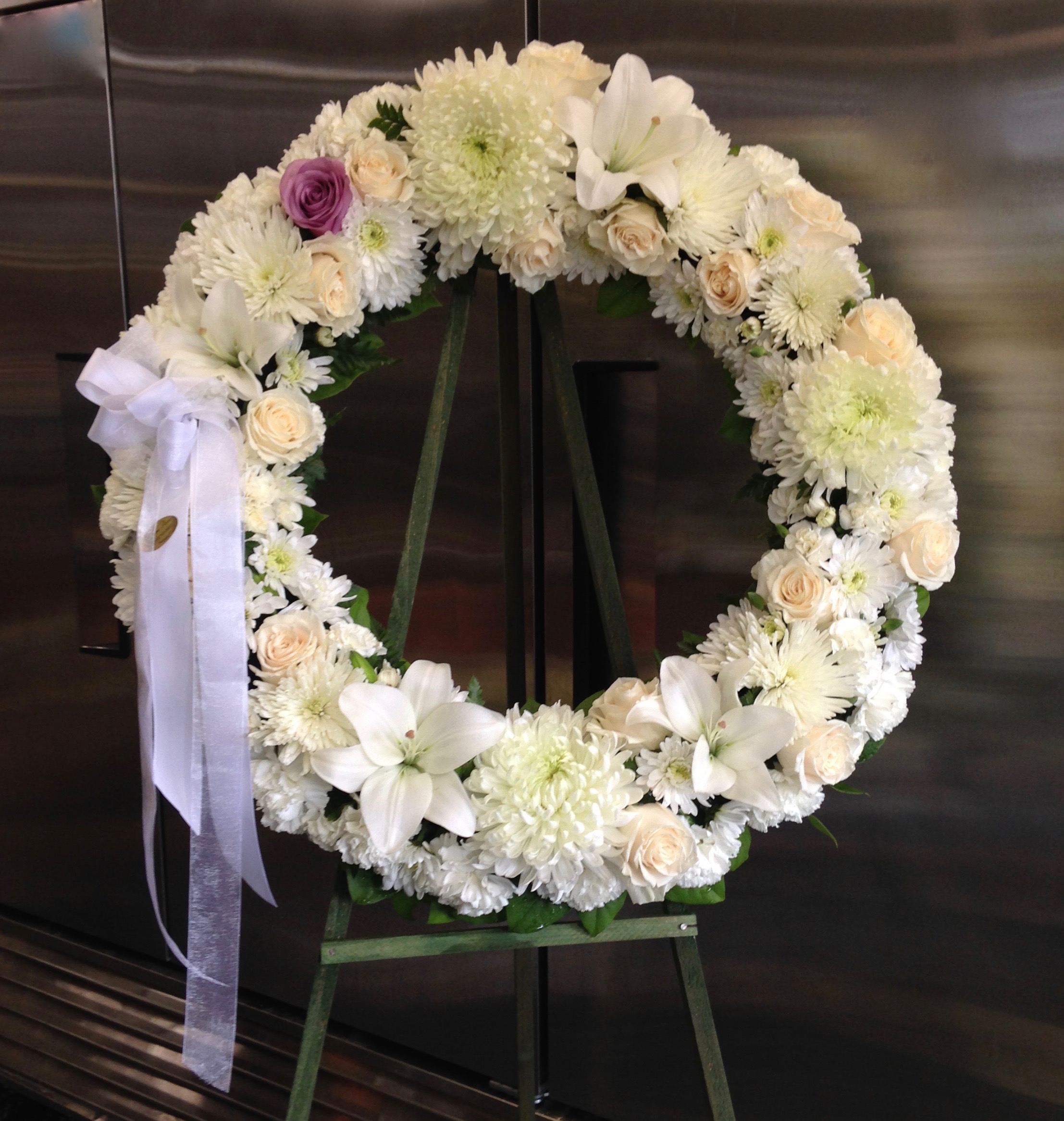 Special Thoughts Wreath. Funeral Flowers. Sympathy Flowers. Fresh Flower delivery. White flowers wreath. Mums, lilies and roses.