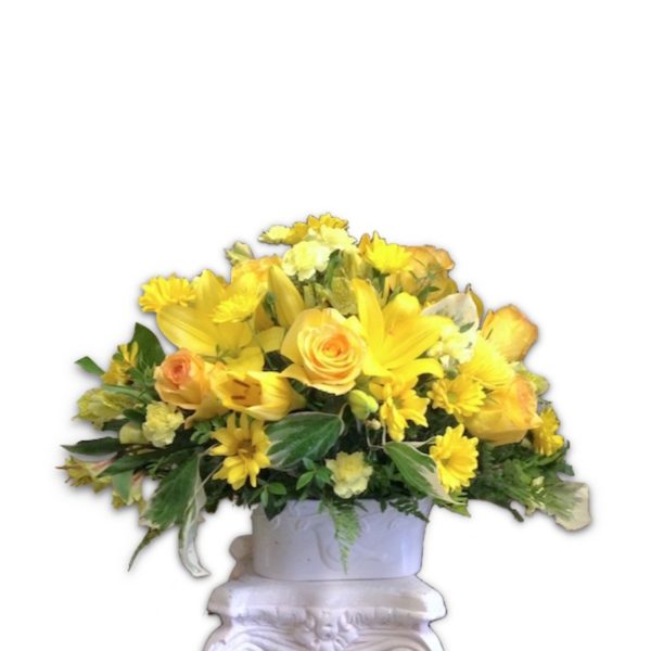 Yellow combination of roses, asiatic lilies, daisies and mini carnations with green fillers in a white vase.