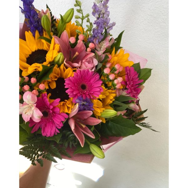 Colorful combination of sunflowers with pink lilies, alstroemerias, roses and gerbera daisies with seasonal fillers wrapped in paper.
