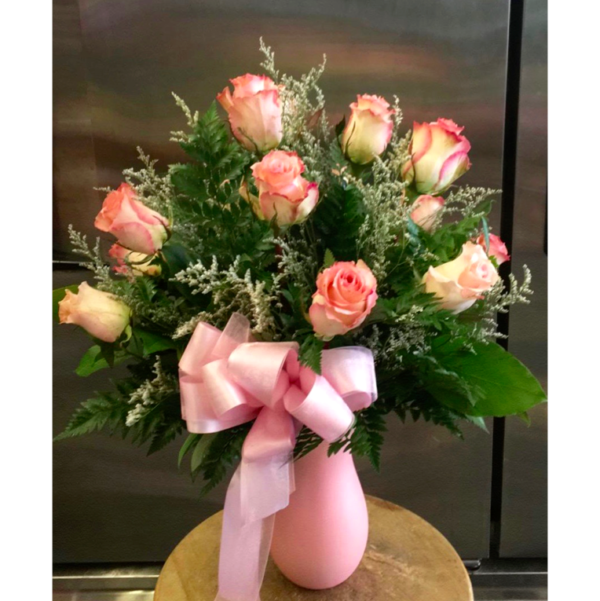 Special Pink roses with white fillers in a pink ceramic vase vase and a matching bow.
