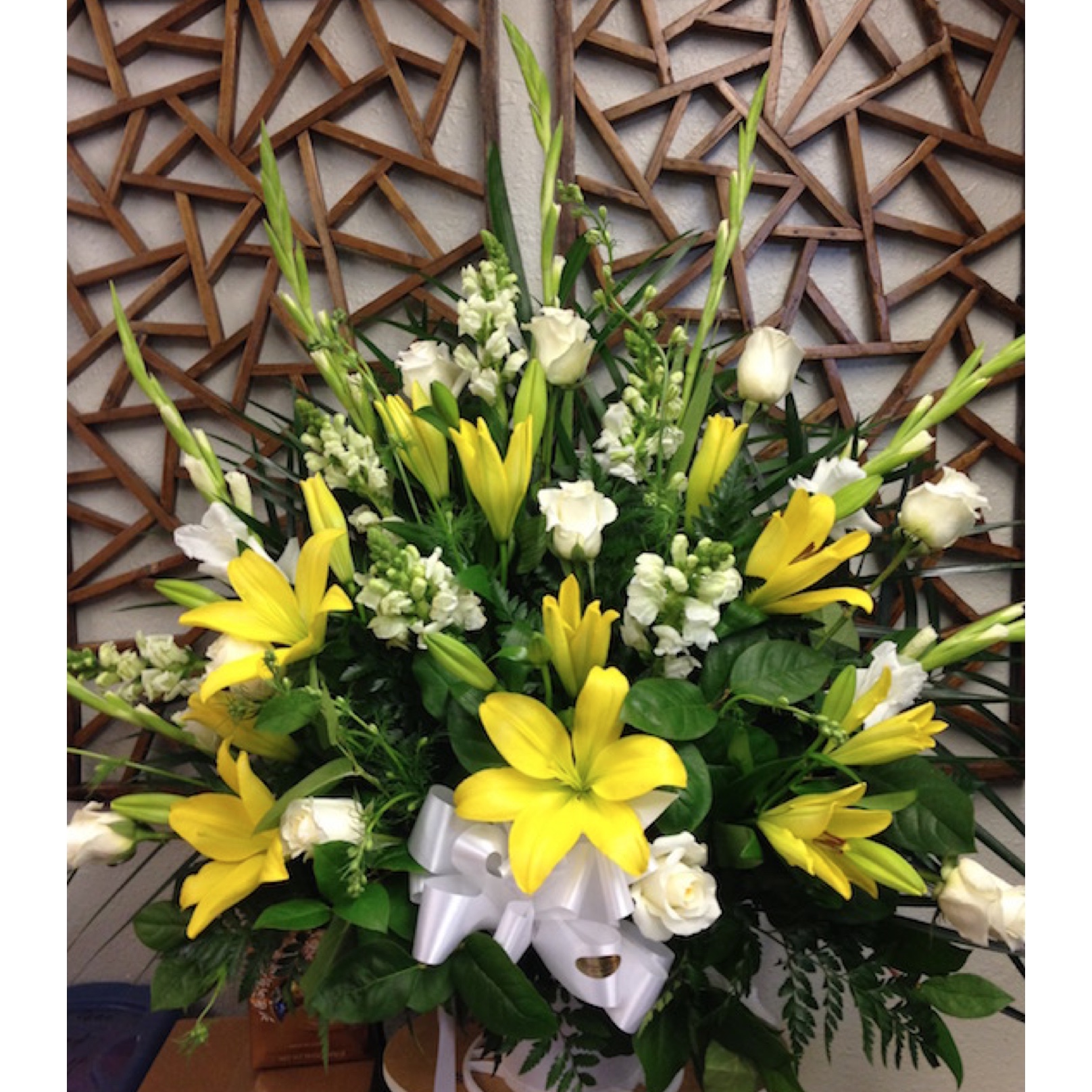 Sympathy Flowers. Funeral Flowers. Fresh Flower delivery. Yellow and white floor vase. Lilies, roses, gladiolus, snapdragons.