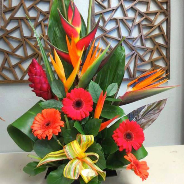 Birds of paradise heliconia ginger and gerbers with Ti leaves in a square vase. Order 5 days in advance, subjected to availability of birds of paradise