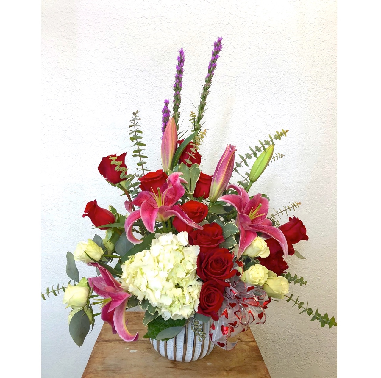 Red and white roses, hydrangeas, lilies and eucalyptus in a decorative ceramic vase.