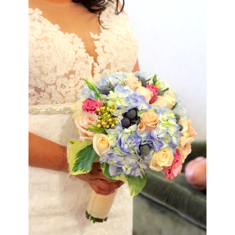 Combination of flowers includes: roses, lisianthus, hydrangeas and matching fillers
